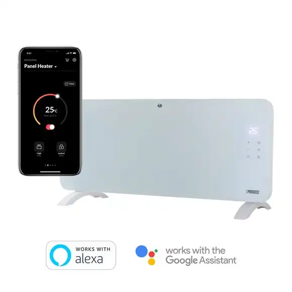 Warm up your home or office with style and ease with the Princess 2000 Watt Smart Glass Panel Heater for quick and efficient heating. This sleek, ultra-stylish and effective heater offers versatility with form and functionality with wall mounting ability for a neat and tidy space, or free standing for a close and cosy feel. Easy to control with the LED touch screen or the specially designed HomeWizard Climate app (app is compatible with smartphones iOS 10.0 or later & Android 5.0 or later), this smart heater also works with Siri, Alexa and Google Assistant for incredible voice control involvement. Among the long list of impressive functions, this heater includes an electronic thermostat, child safety lock, oscillation technology, timer functions and automatic shut-off for a great heating experience.
